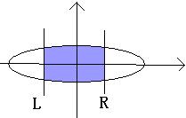 An ellipse in a plane centered on point $O$. The $L, R$ lines will be vertical through the $X$-axis. The problem is calculating the blue intersection area. But calculating the intersection area is dull, so I have to turn to you, a talent of programmer. Your task is telling me the result of calculation. (defined $\pi=3.14159265$, the area of an ellipse $A=\pi ab$)